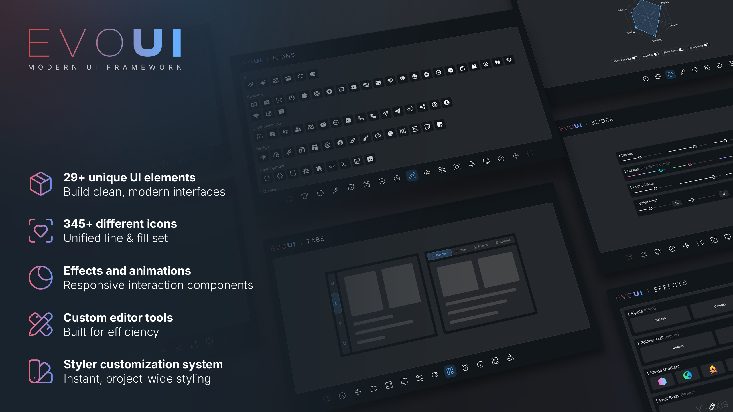 Evo UI is a feature-rich UI framework that provides polished UI elements, components, and workflow tools designed to elevate your project's UI to the next level.