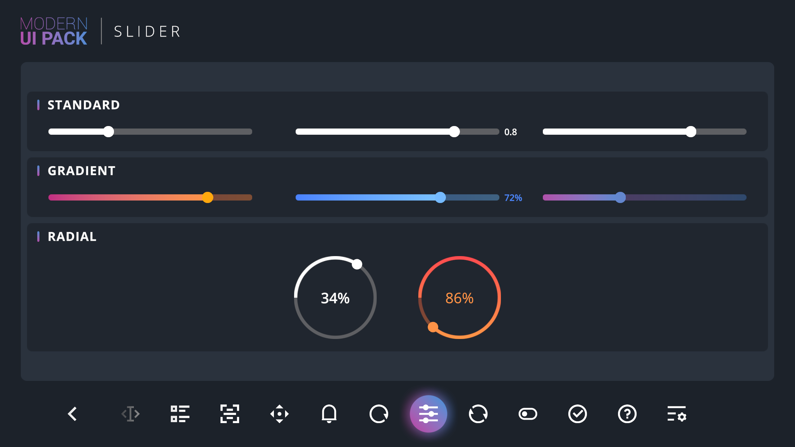 Modern UI Pack includes 18+ different UGUI elements, dozens of presets and sliced sprites, so you can easily create any UI layout you desire.